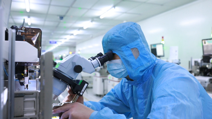 在無塵車間里,機(jī)器一刻不停運(yùn)轉(zhuǎn)著,操作人員正在進(jìn)行裝片。